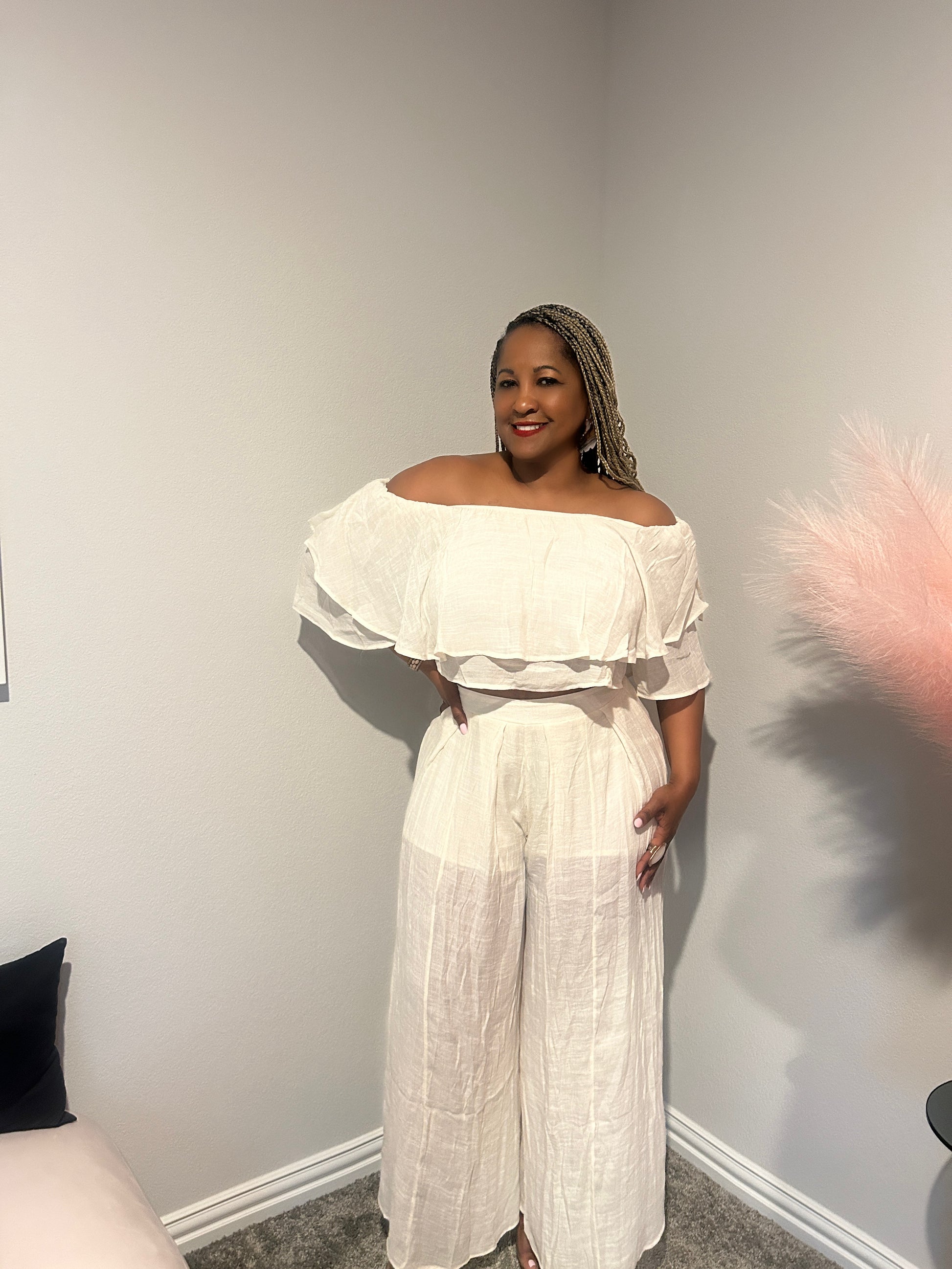 Experience effortless sophistication and comfort with the Carmen Pant Set. The vanilla white off-the-shoulder top features an elasticized neckline, three quarter sleeves, and a double layered silhouette for a flattering fit. Paired with high-waisted, pleated flowy pants for a chic and versatile ensemble.