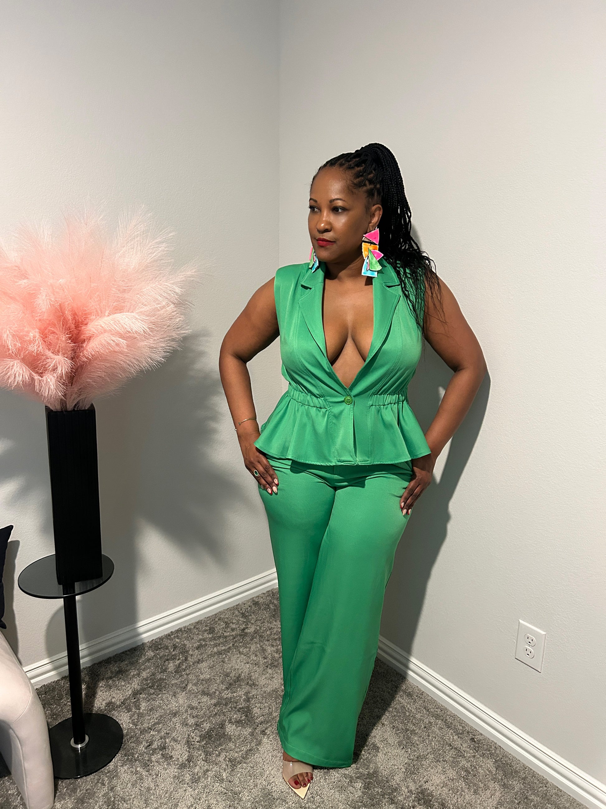 The Ivy Pant Set in vibrant kelly green features a woven vest and minimal stretch pants designed for both style and comfort. The pants offer an elastic waistband with belt loops and functional pockets, providing ease of wear and practicality. The vest is tailored with an elastic back and button closure, ensuring a flexible fit and polished appearance. This set is ideal for a refined, professional look with added comfort.