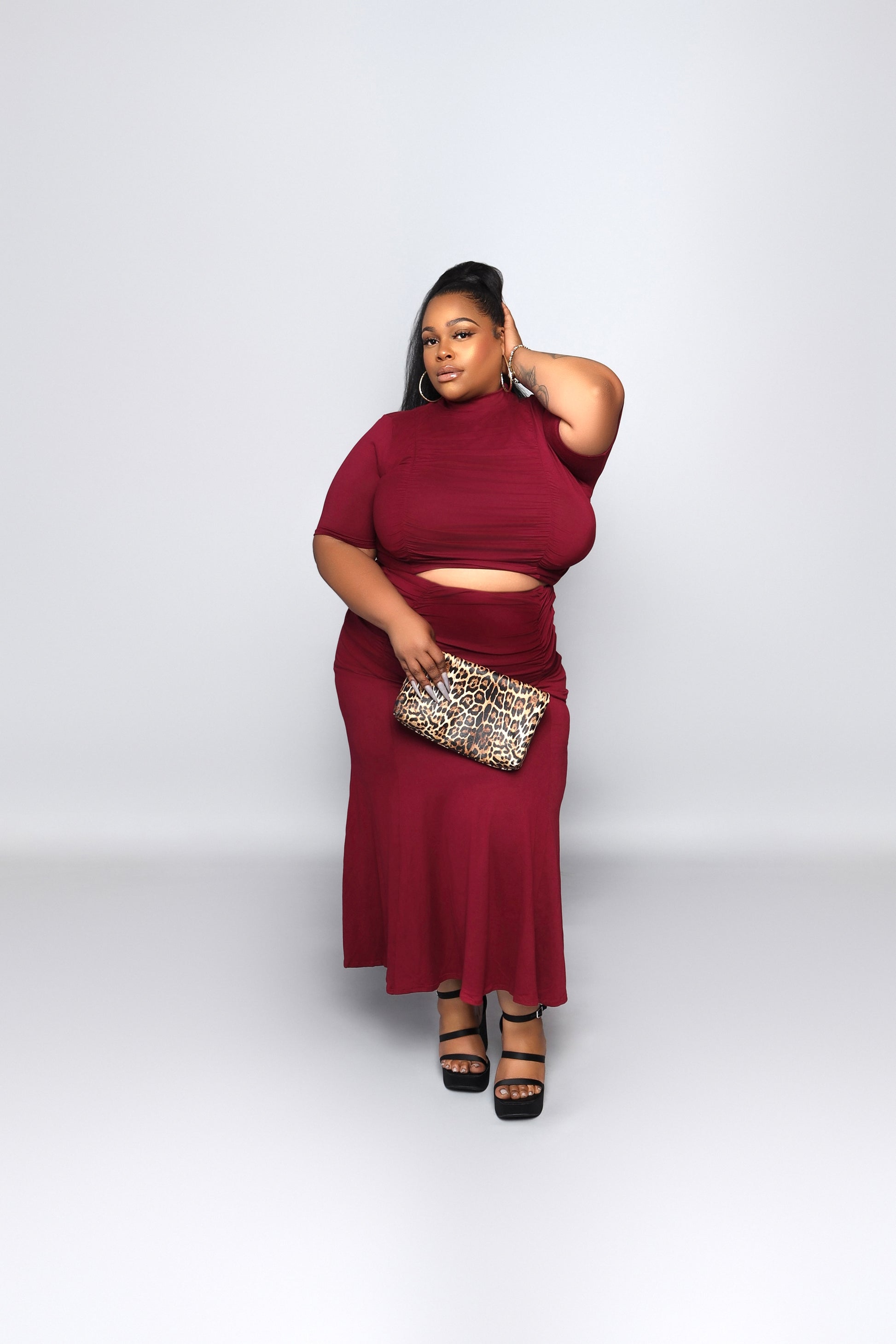 Get ready to elevate your fashion game with our wine shirred top flare maxi skirt set. Made with a stretchy and flattering fabric, this set is designed to elongate your silhouette. Available in sizes 1x-3x, it's perfect for any body type. Add this versatile set to your wardrobe today!