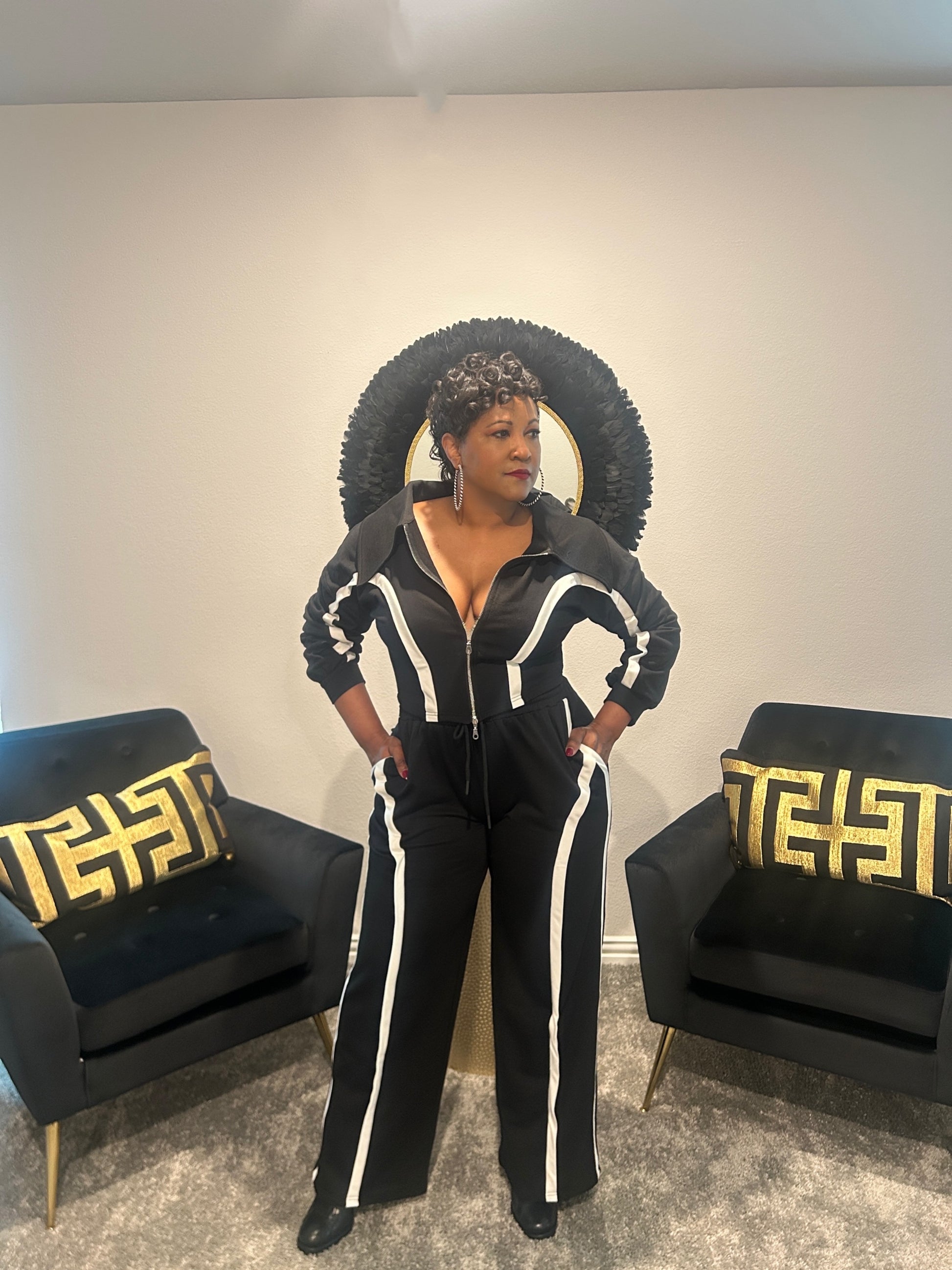 Introducing the Motion Track Set - the perfect combination of style and comfort. This black track set features white strips and a crop jacket with a trendy collar and zipper front closure. Paired with high waist loose fit pants, this set is perfect for taking on the city in style. Stand out from the crowd with this must-have addition to your wardrobe.